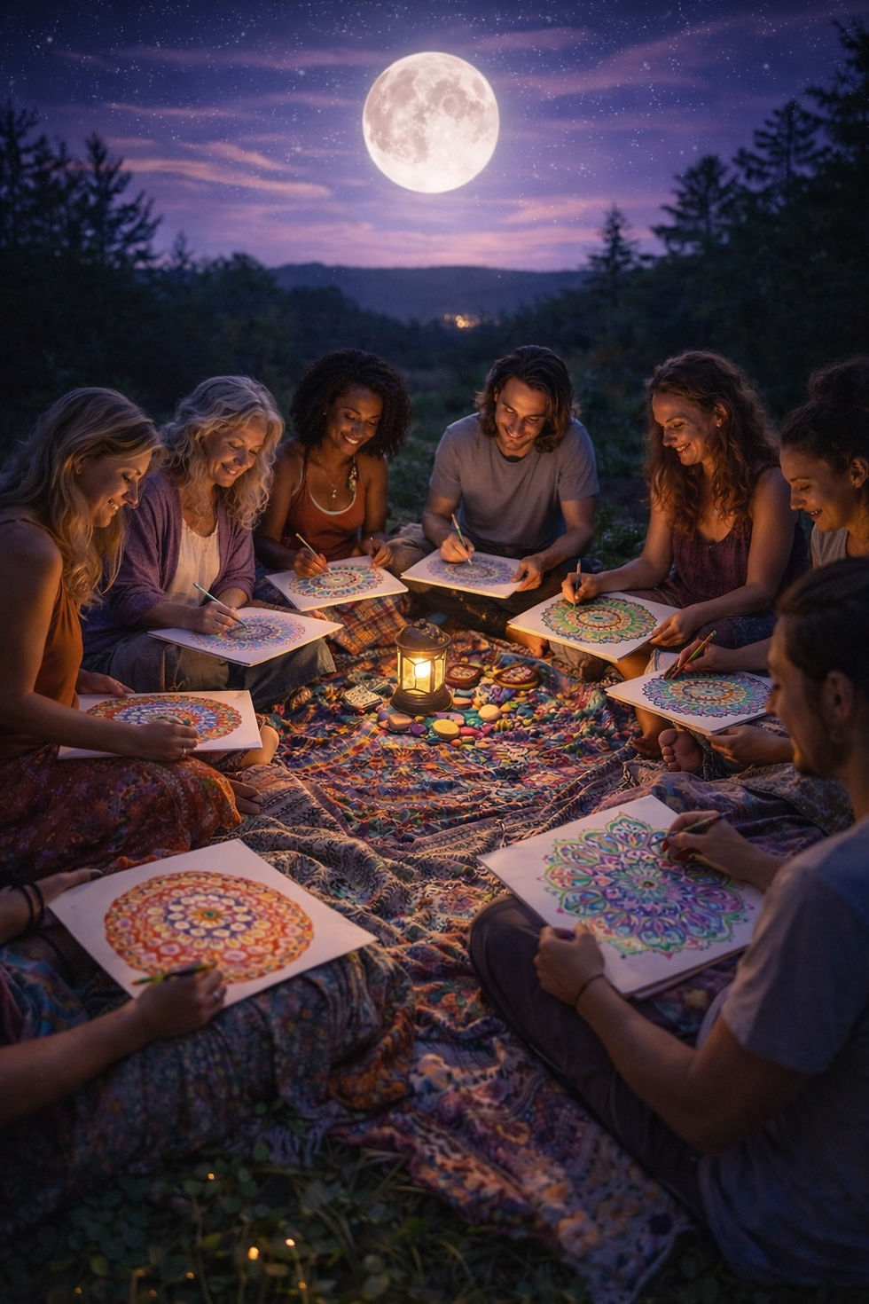 Full moon energy meets mindfullness and creative expression. Come relax into a grounded moving meditation and play with colour, shape, and imagination as we create mandalas together in a fun, active, art-filled social circle.